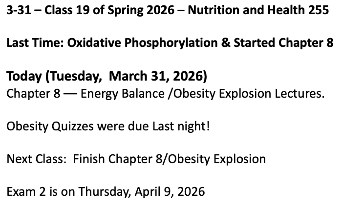 Class 18 – Nutrition and Health – Spring 2026 – March 26th – McGuire Chapter 7 – Oxidative – Phosphorylation; Chapter 8 – Regulation of Energy Intake