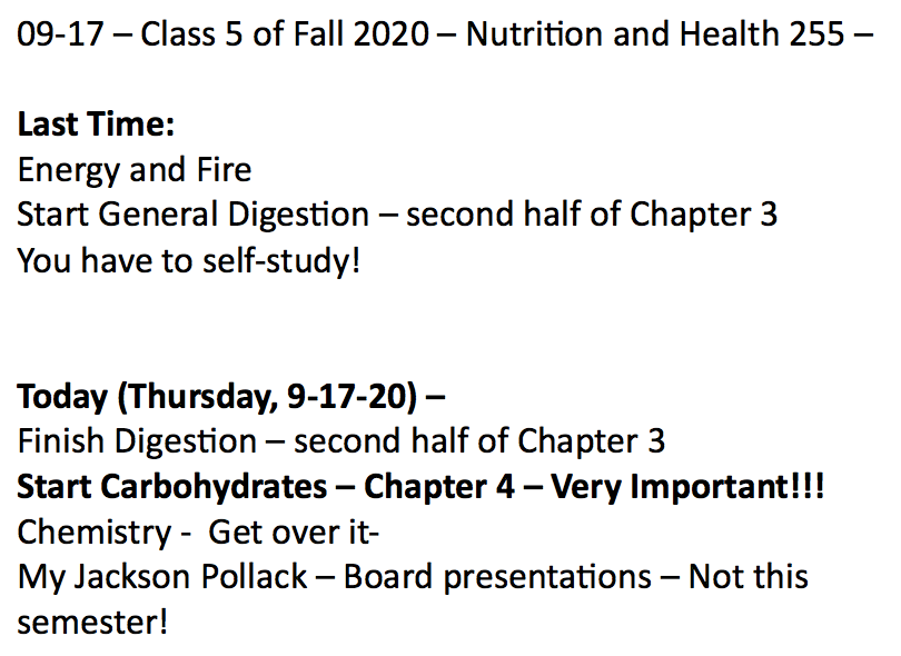 Update for 255 – 9-17-2020 I am sending this both by Sakai and Canvas (and putting on the blog) because I am having problems with Canvas emails. If you get this email by Sakai but not by Canvas, please let me know. Remember, I really don’t know what is going on at your end. All of this is new to me too! For example, I didn’t know that I did not publish the Module for yesterday’s lecture. Therefore, you couldn’t see the slides for yesterday’s lecture. I had put them on Canvas last week and will usually put Powerpoints on Canvas by the night before a lecture. So if don’t have access to slides by the night before, please email me! Thanks!