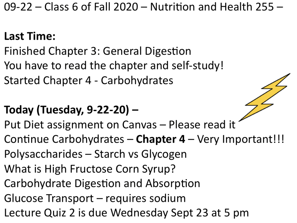 Class 6 – Nutrition and Health – Fall 2020 – Sept 22nd – Chapter 4 of McGuire Text – Continue Carbohydrates