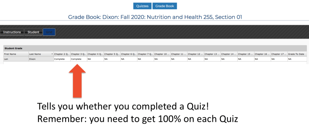 You can keep track of the quizzes you take by going to the Grade Book – Grid Button – you will see something like this: