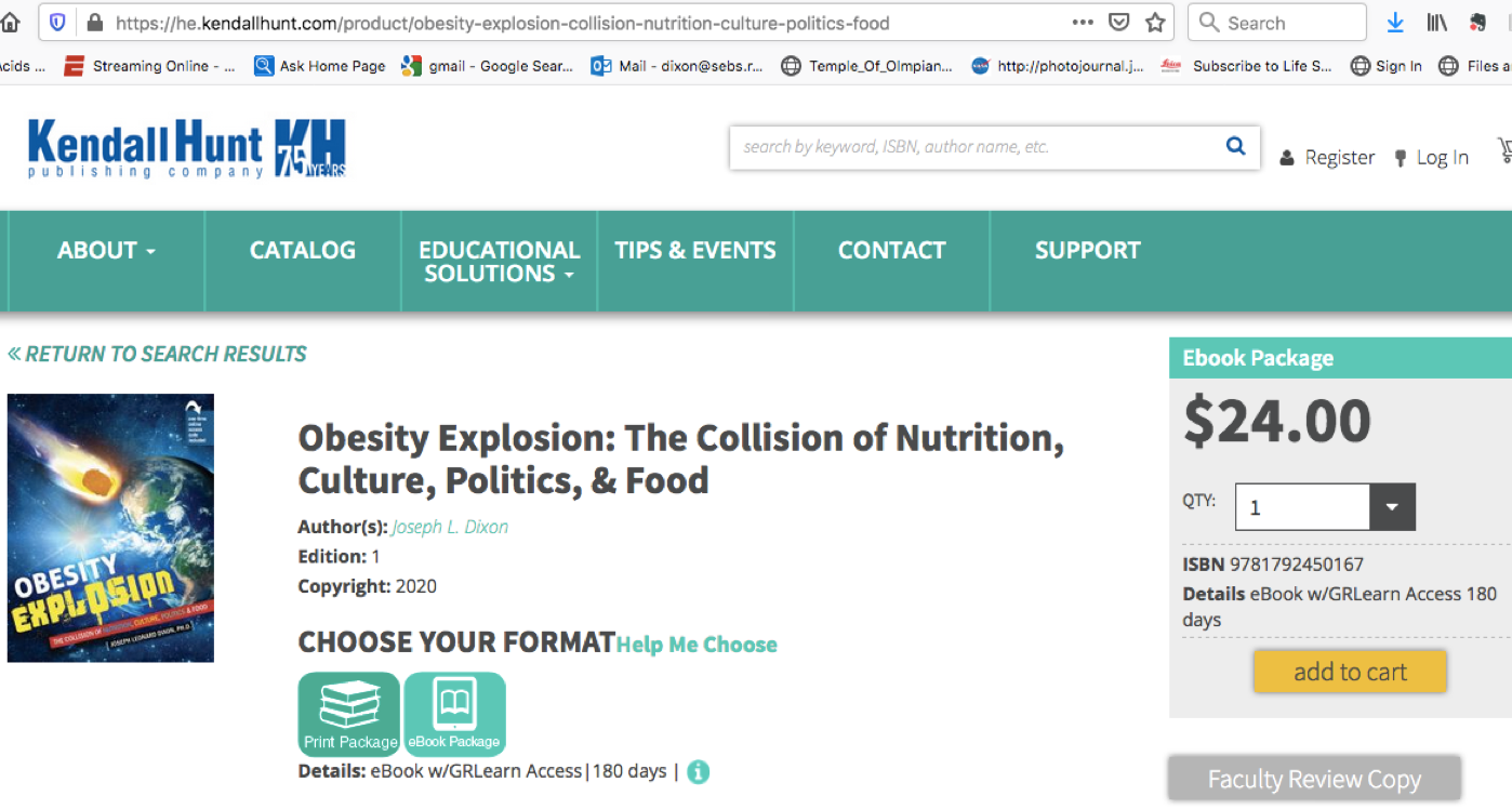 Second Book – Obesity Explosion – The Collision of Nutrition, Culture, Politics, and Food, by Joseph L. Dixon, Published on August 24, 2020; Kendall Hunt Publishing Company.