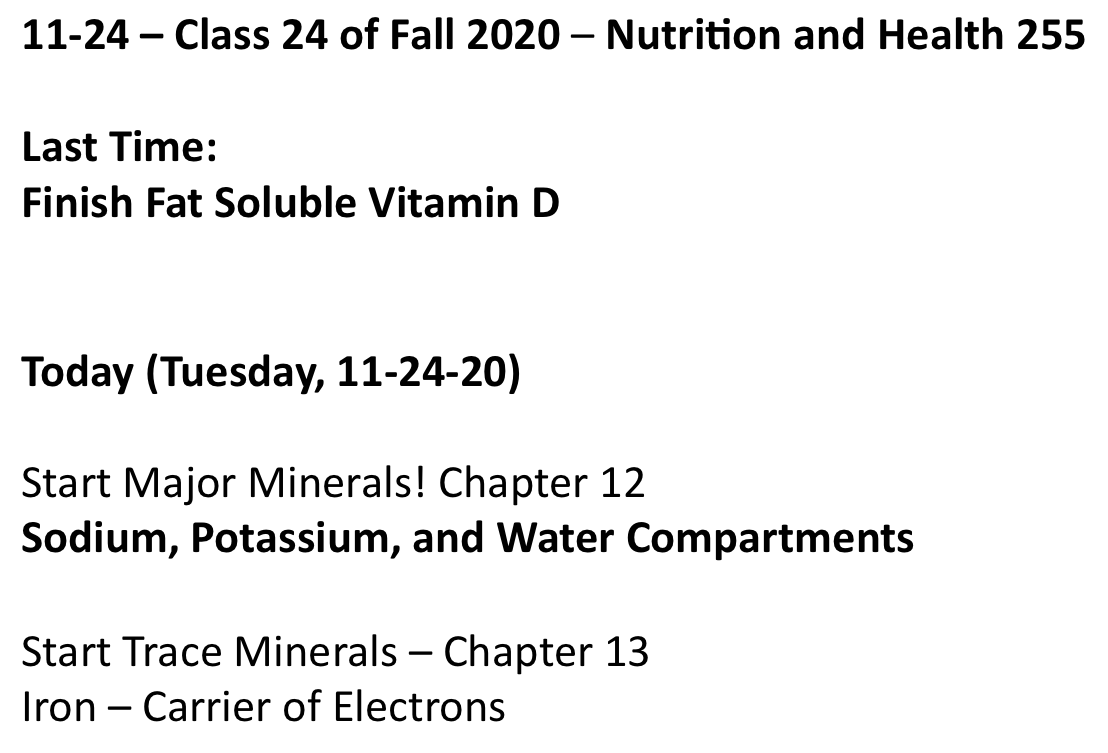Class 24 – Nutrition and Health – Fall 2020 – Nov 24th- Chapters 12 & 13 in McGuire – Major and Trace Minerals and the Beginning of Life