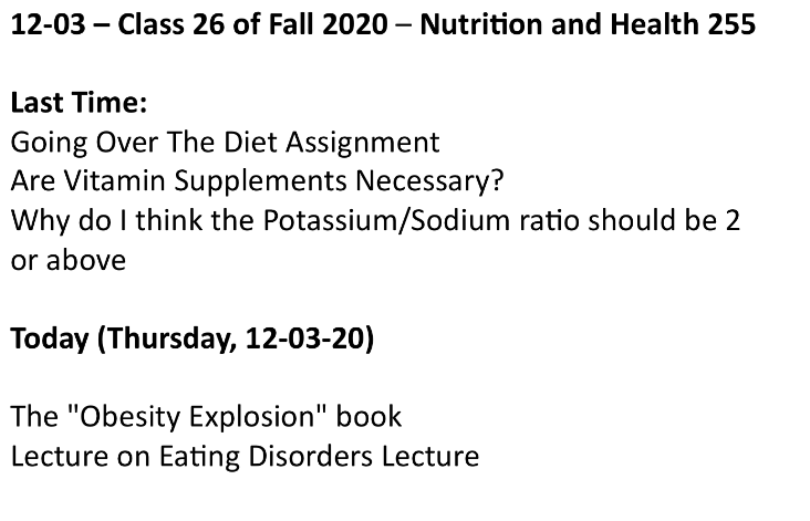 Class 26 – Nutrition and Health – Fall 2020 – Dec 3 – The “Obesity Explosion” book; Lecture on Eating Disorders