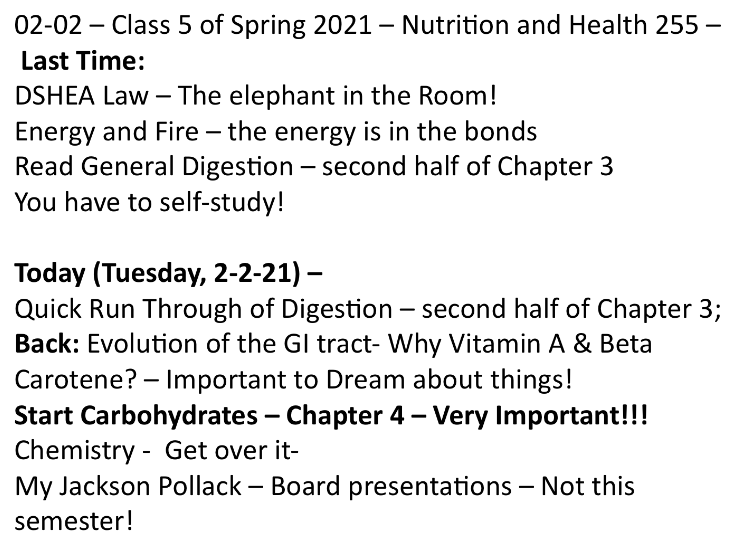 Class 5 – Nutrition and Health – Spring 2021 – Feb 2nd – Chapter 3 (2nd Half) of McGuire Text – Digestion; Start Chapter 4 – Carbohydrates