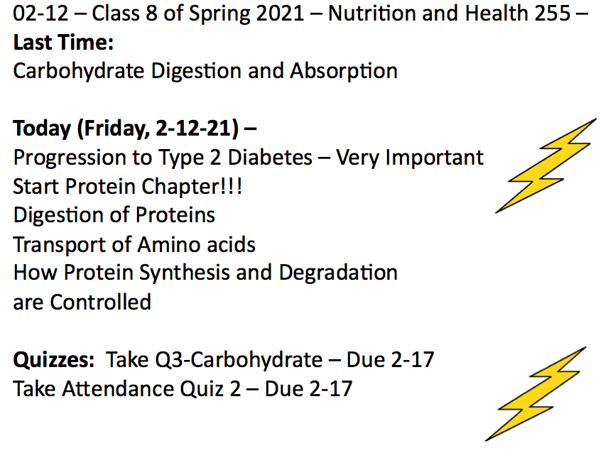 Class 8 – Nutrition and Health – Spring 2021 – Feb 12th – Finish Type 2 Diabetes – Start Chapter 5 McGuire Text – Protein and Amino Acids