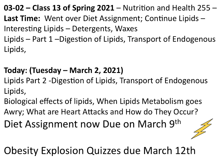 Class 13 – Nutrition and Health – Spring 2021 – March 2nd – Chapter 6 in McGuire – The Wonderful World of Lipids – Lecture 2