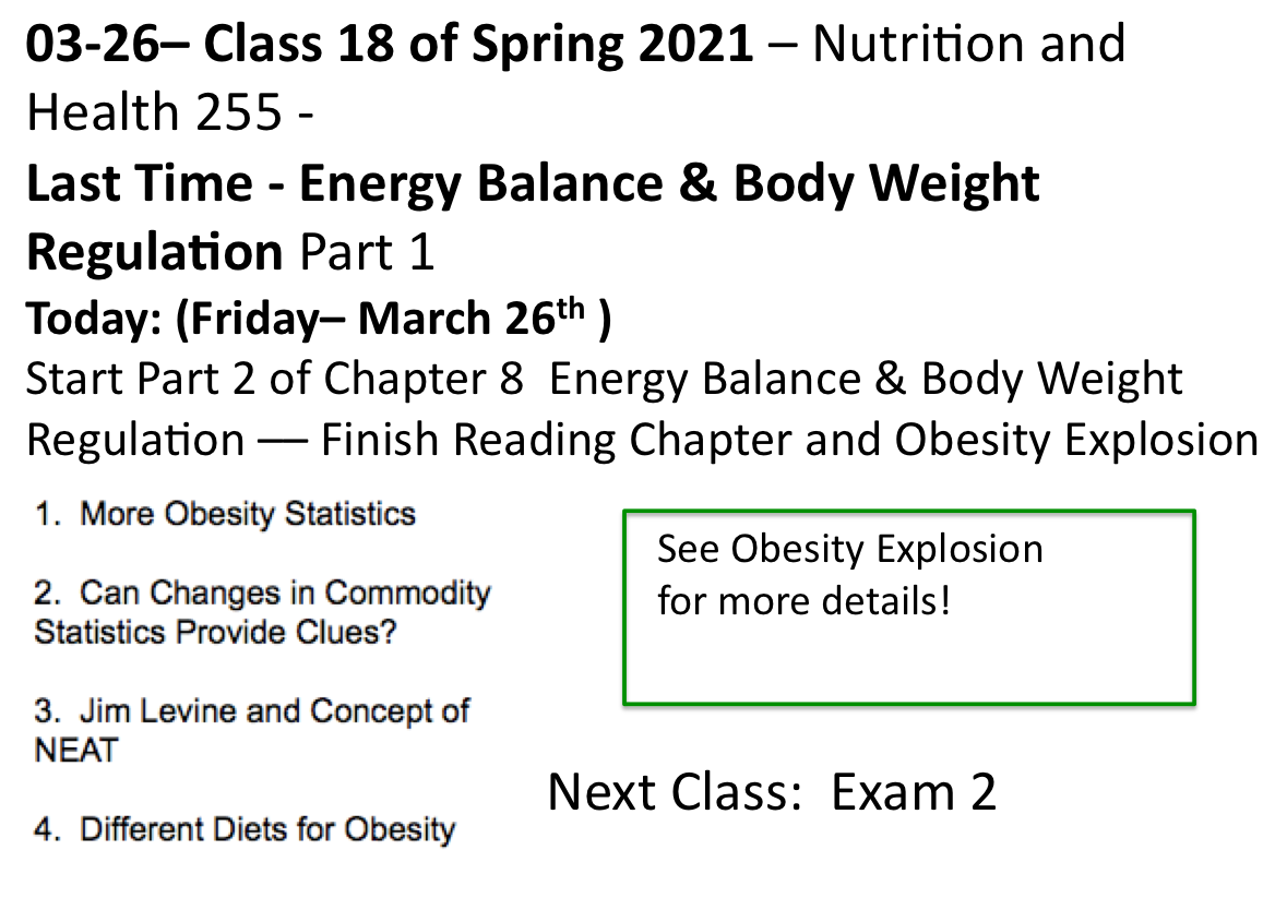 Class 18 – Nutrition and Health – Spring 2021 – March 26th – Chapter 8 in McGuire and Obesity Explosion Book – Part 2
