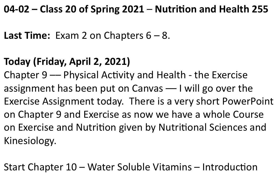 Class 20 – Nutrition and Health – Spring 2021 – April 2nd – Chapter 9 (Short) and Chapter 10 in McGuire Text – Water Soluble Vitamins