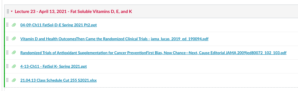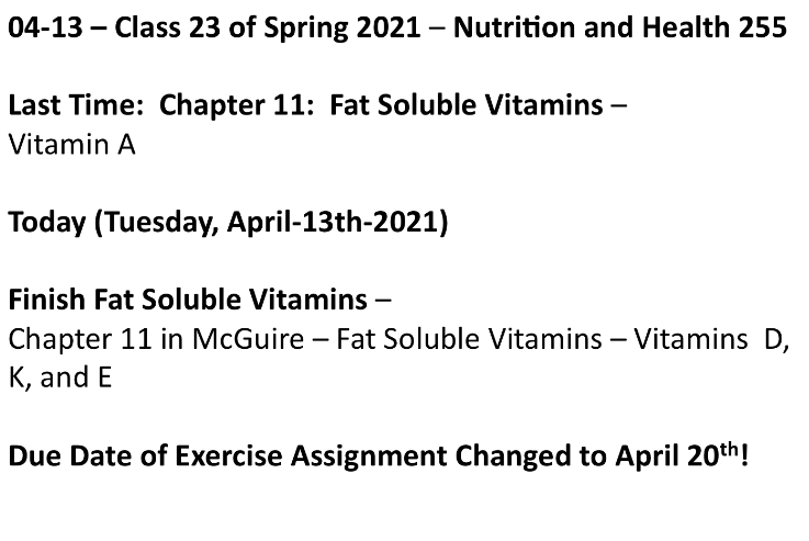 Class 23 – Nutrition and Health – Spring 2021 – April 13th – Chapter 11 in McGuire Text – Fat Soluble Vitamins