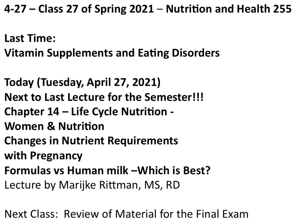 Class 27 – Nutrition and Health – Spring 2021 – April 27th – Infant Nutrition, Pregnancy, and different milks; Lecture by Marijke Rittmann, MS, RD