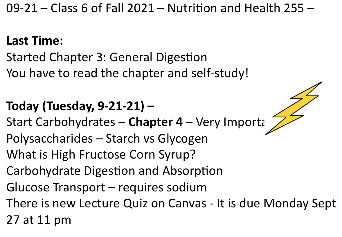 Class 6 – Nutrition and Health – Fall 2021 – September 21st – McGuire Chapter 4 – Start Carbohydrate