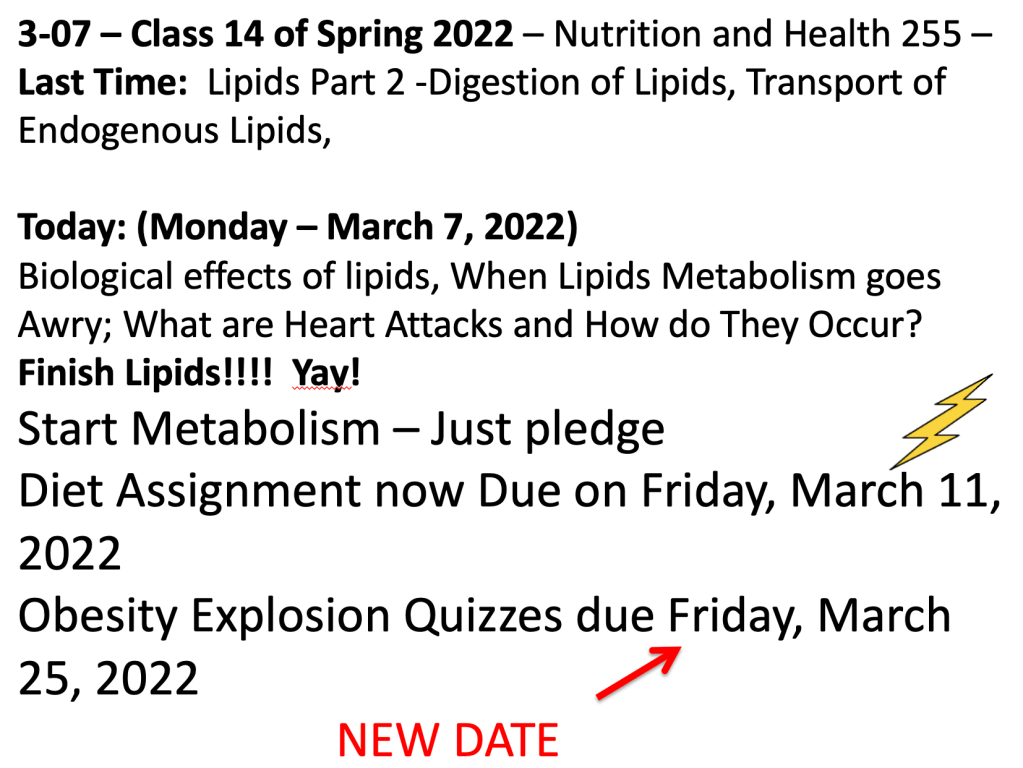 Class 14 – Nutrition and Health – Spring 2022 – March 7th – Chapter 6 in McGuire – Finish Lipids; Start Chapter 7 – Metabolism