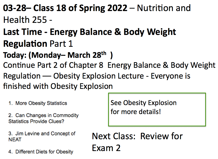 Class 18 – Nutrition and Health – Spring 2022 – March 28th – Chapter 8 in McGuire & Obesity Explosion Book
