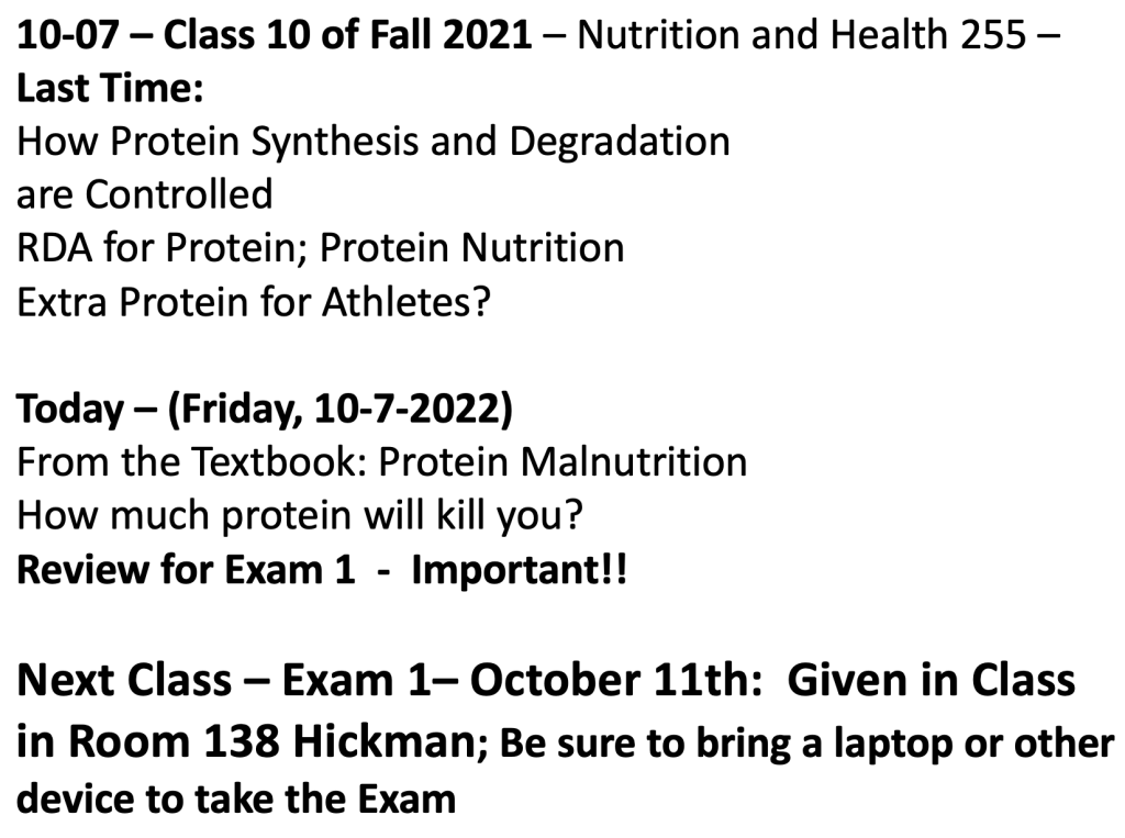 Class 10 – Nutrition and Health – Fall 2022 – October 7th – Chapter 5 in McGuire – Protein! Part 2 – RDA for Protein, Protein Nutrition under Diverse Conditions; Also Review for Exam 1 next Class