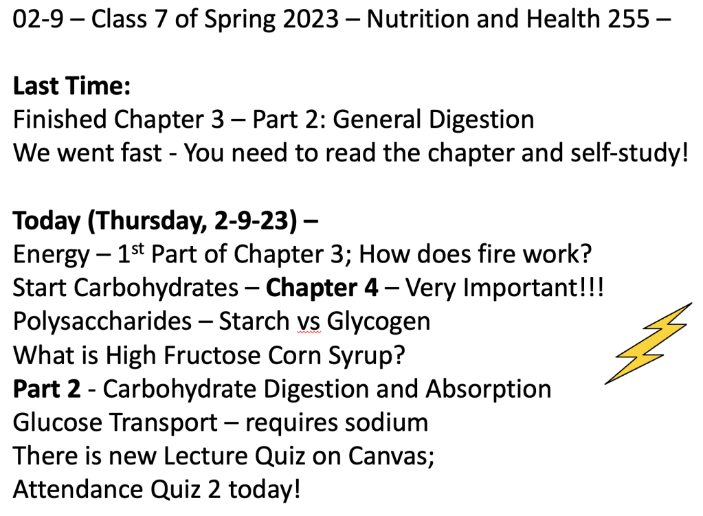 Class 7 – Nutrition and Health – Spring 2023 – February 9th Finish Chapter 3 in McGuire – Where does Energy Come From? Start Chapter 4 – Carbohydrates