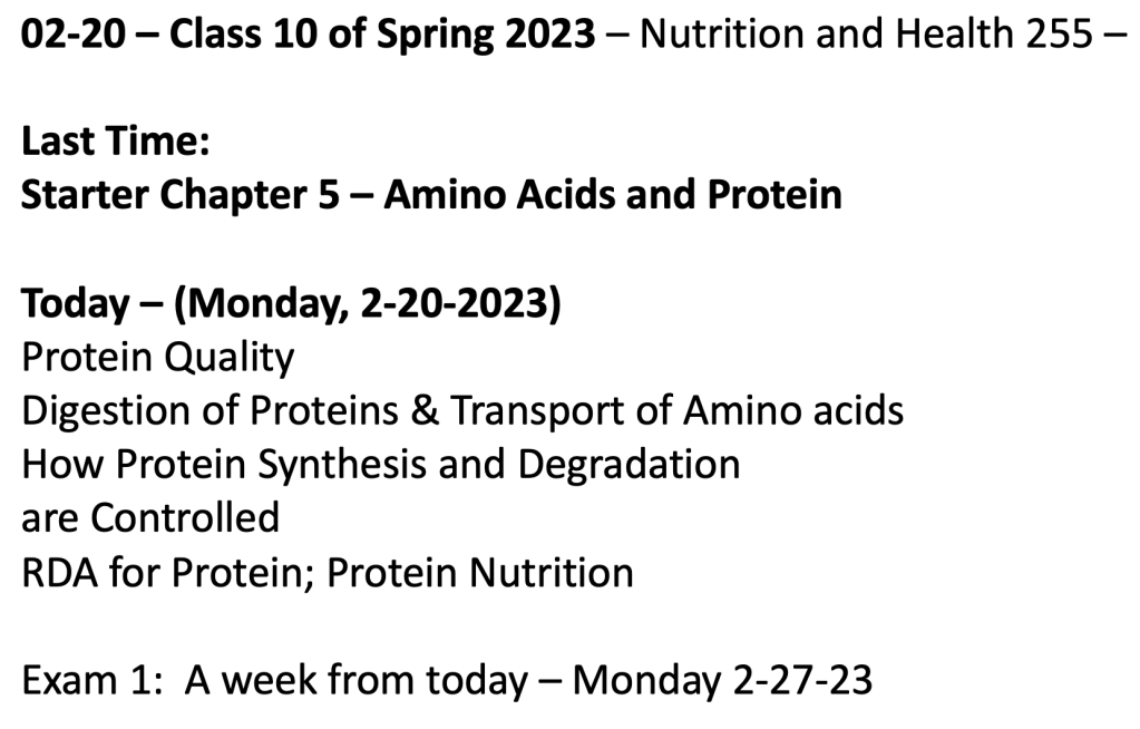 Class 10 – Nutrition and Health – Spring 2023 – February 20th – Start Chapter 5 – Protein – Part 1 – Amino Acids