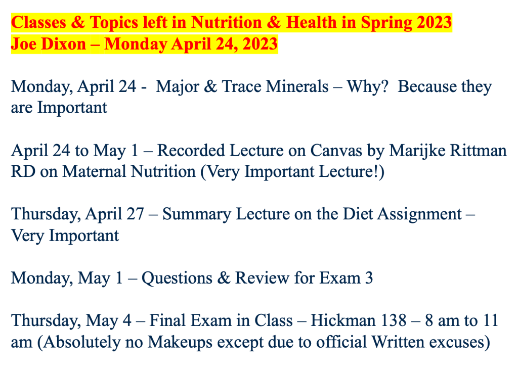 Class 26 – Nutrition and Health – Spring 2023 – April 24th -Lecture on Major & Trace Minerals – Chapters 12 & 13 in McGuire Textbook