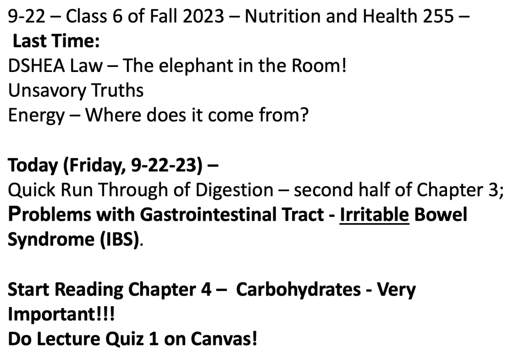 Class 6 – Nutrition and Health – Fall 2023 – Sept 22nd – ONLINE – McGuire 3rd-4th Edition – Chapter 3 part 2 – Intestine and Digestion