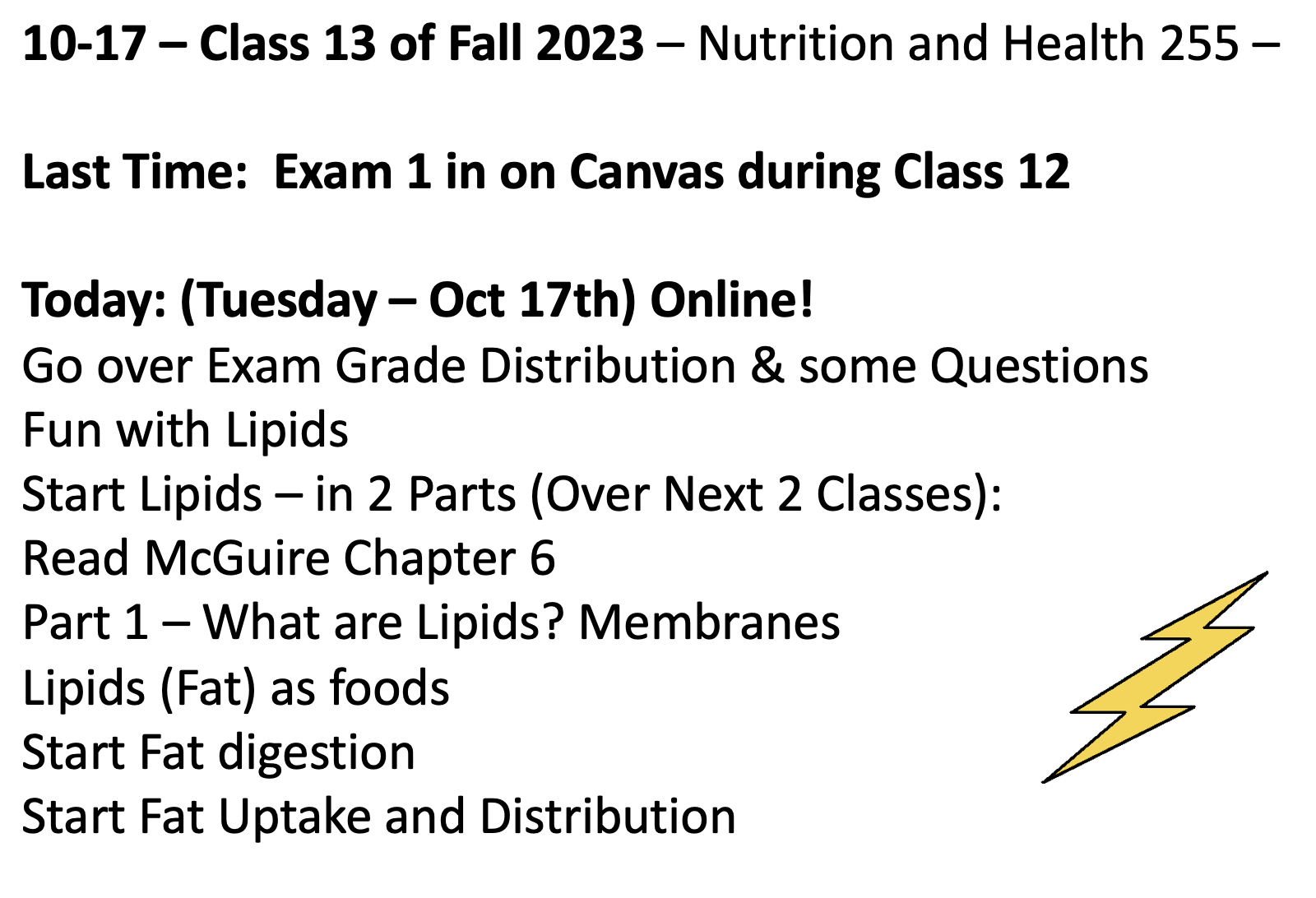 Class 13 – Nutrition and Health – Fall 2023 – October 17th – ONLINE – McGuire 3rd-4th Edition – – Chapter 6 – Part 1 – Lipids – Fat