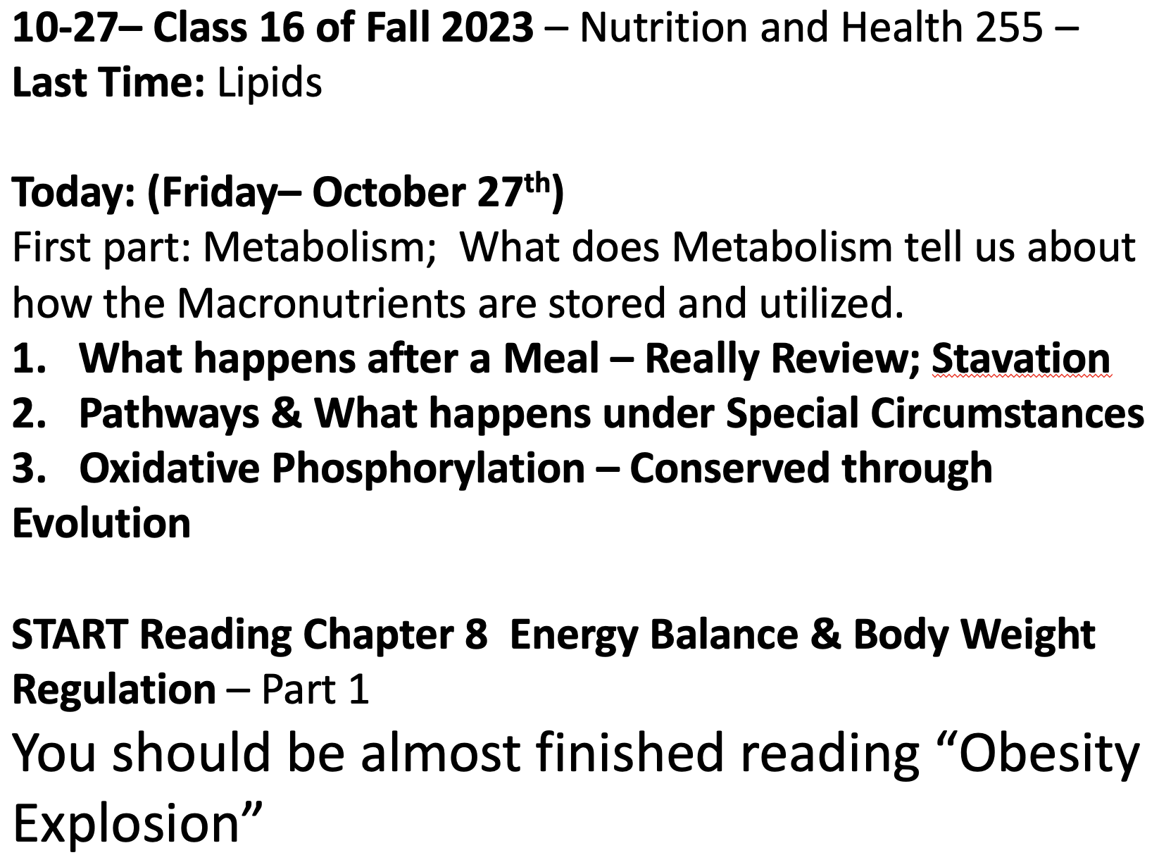 Class 16 – Nutrition and Health – Fall 2023 – October 27th – In the Classroom! – McGuire 3rd-4th Edition – Chapter 7 – Metabolism