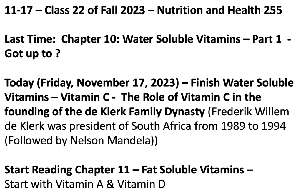 Class 22 – Nutrition and Health – Fall 2023 – November 17th – Water-Soluble Vitamins Part 2; Chapter 10 in McGuire