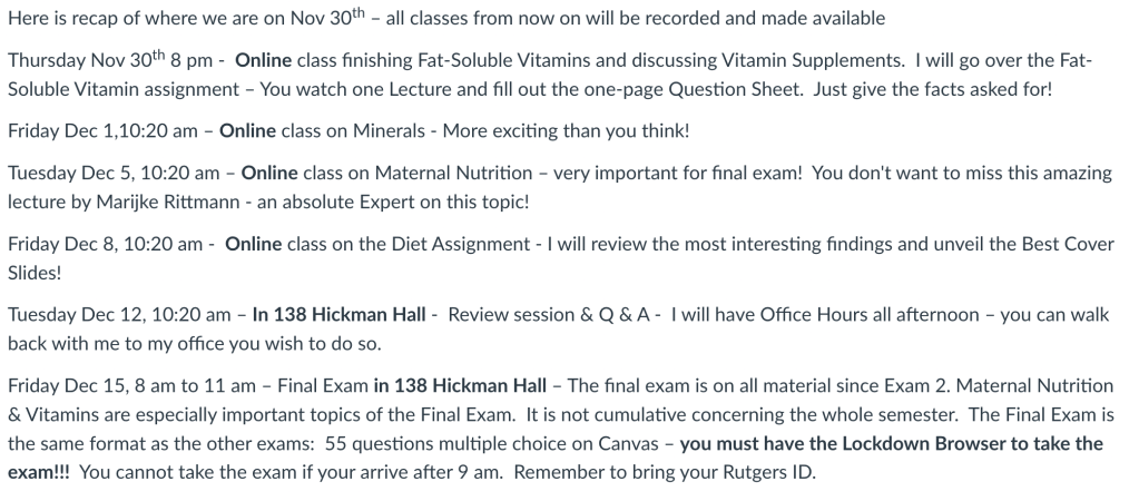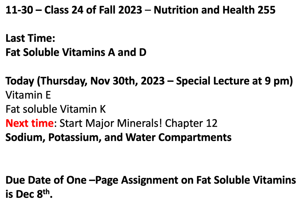 Class 24 – Nutrition and Health – Fall 2023 – November 30th – Finish Fat-Soluble Vitamins; Chapter 11 in McGuire – Vitamins E and K – Special Zoom Lecture at 9 pm
