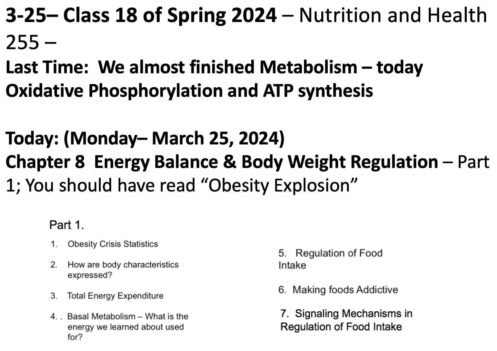 Class 18 – Nutrition and Health – Spring 2024 – March 25th – Chapter 7 in McGuire – Krebs Cycle – Chemi-Osmotic Mechanism of ATP Synthesis; Chapter 8 Energy Balance & Body Weight Regulation