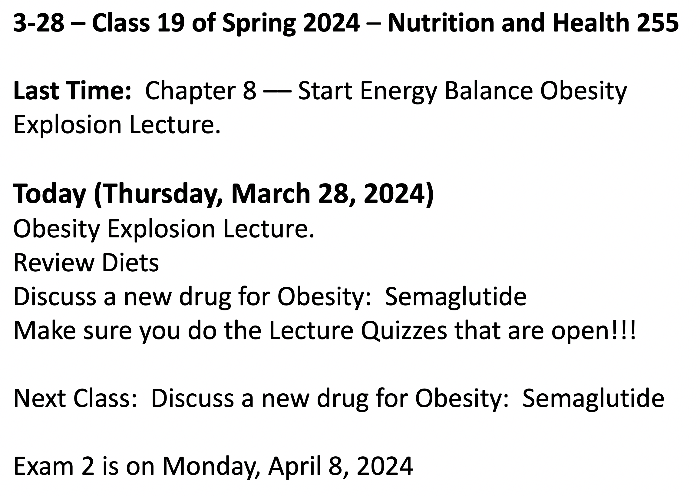 Class 19 – Nutrition and Health – Spring 2024 – March 28th – Chapter 8 in McGuire – Energy Balance & Body Weight Regulation