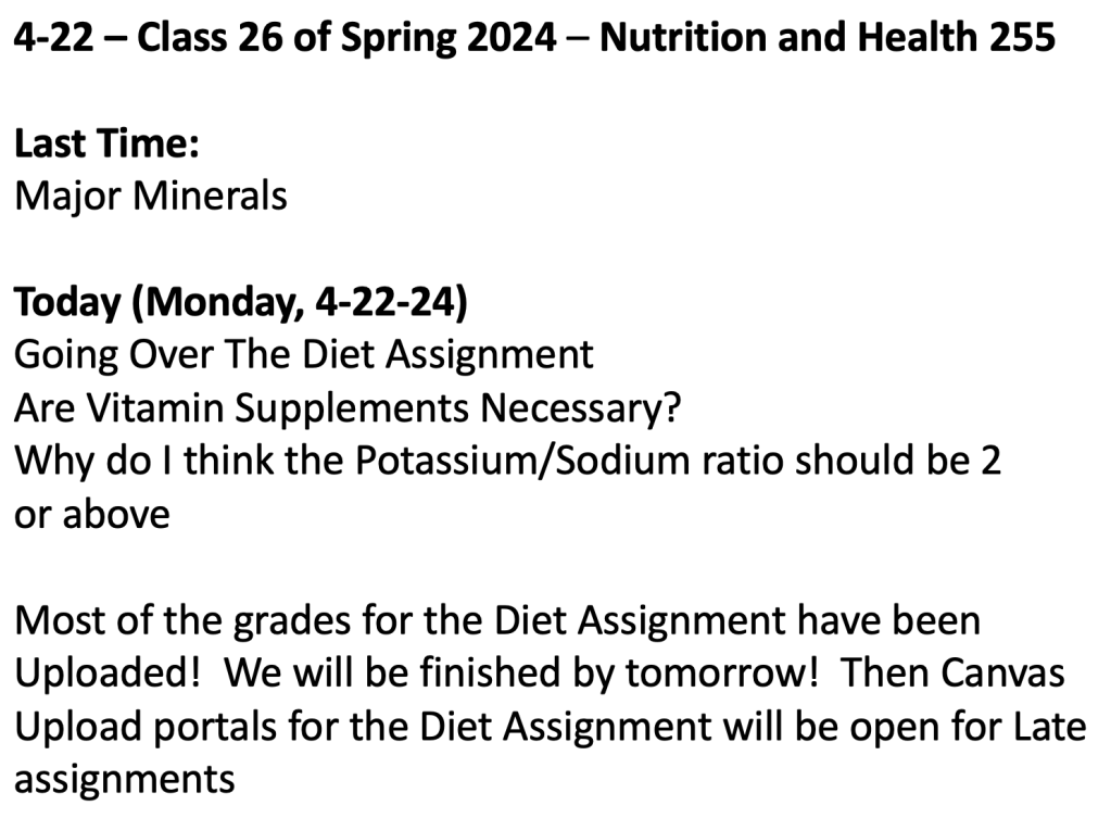 Class 26 – Nutrition and Health – Spring 2024 – April 22nd – All Chapters in McGuire – The Diet Assignment – what it tells us!