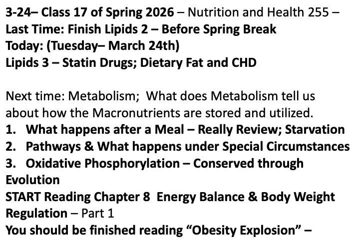 Class 17 – Nutrition and Health – Spring 2026 – March 24th – Class after Spring Break; McGuire Chapter 6 – Lipids – Fat – Part 3 – Statin Drugs
