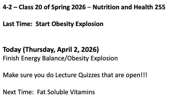 Class 120 – Nutrition and Health – Spring 2026 – April 2, 2026 – Finish Regulation of Energy Intake and Obesity Explosion