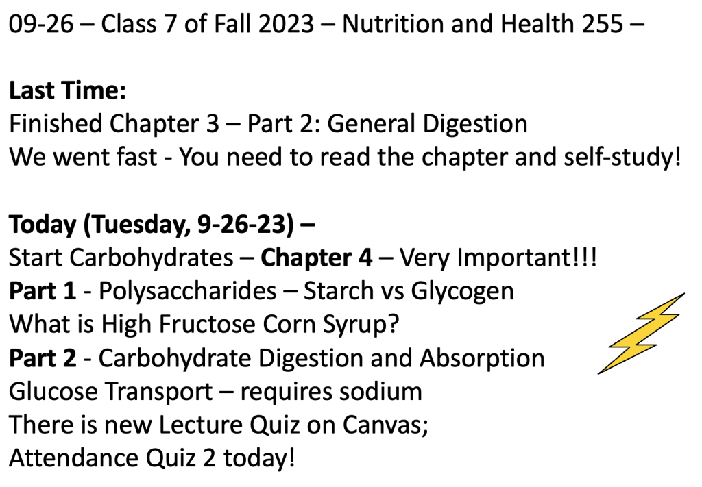 Class 7 – Nutrition and Health – Fall 2023 – Sept 26th – ONLINE – McGuire 3rd-4th Edition – Chapter 4 – Carbohydrates