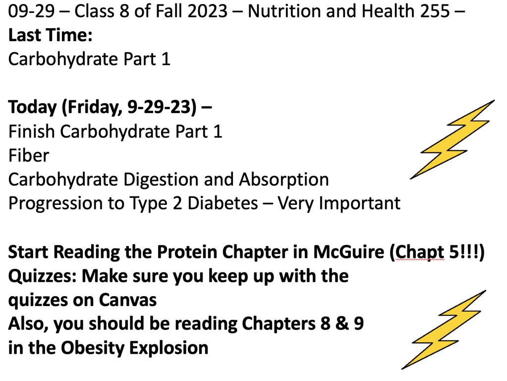 Class 9 – Nutrition and Health – Fall 2023 – October 3rd – ONLINE – McGuire 3rd-4th Edition – Chapter 4 – Carbohydrates – Fiber, Insulin, & Type 2 Diabetes