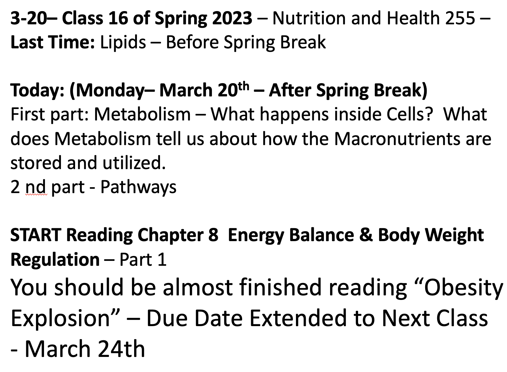Class 16 – Nutrition and Health – Spring 2023 – March 20th – Start Chapter 7 – Metabolism – After Spring Break