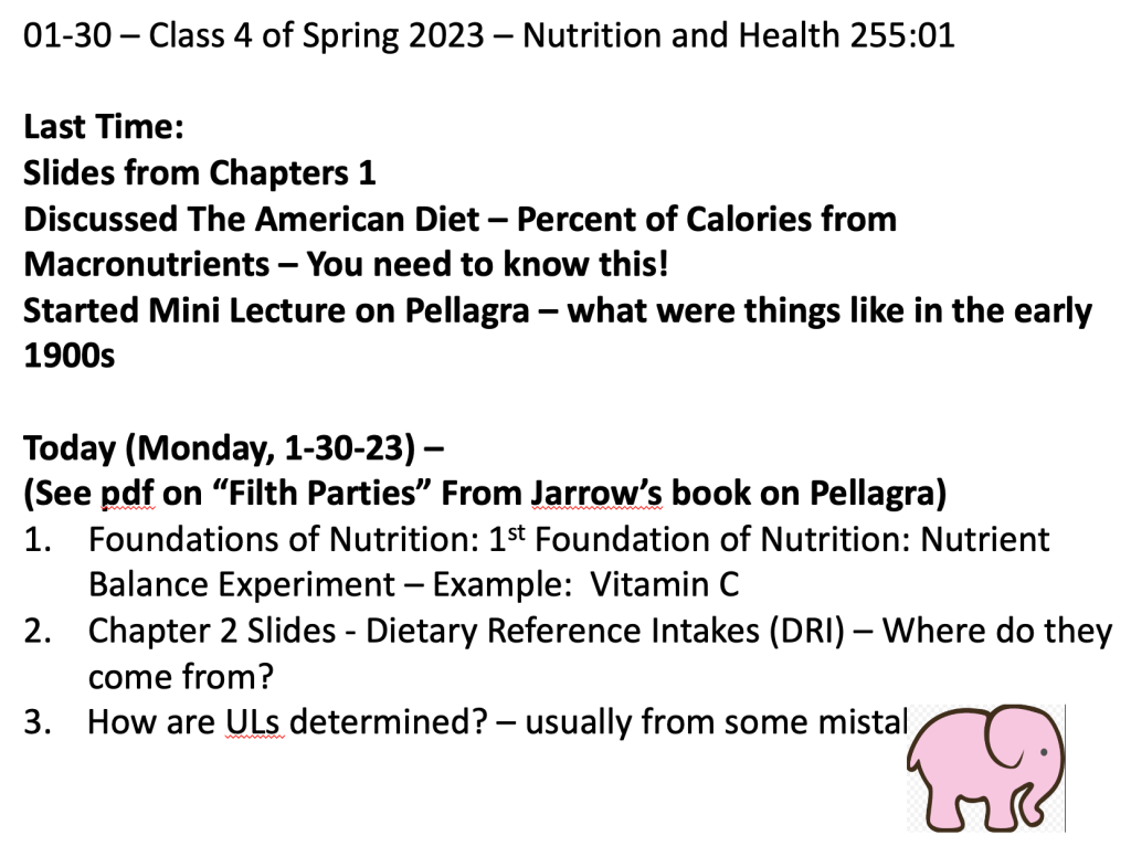 Class 4 – Nutrition and Health – Spring 2023 – January 30th – Chapter 2 in McGuire – DRIs – Finish Pellagra Lecture – Start Lecture on D’SHEA