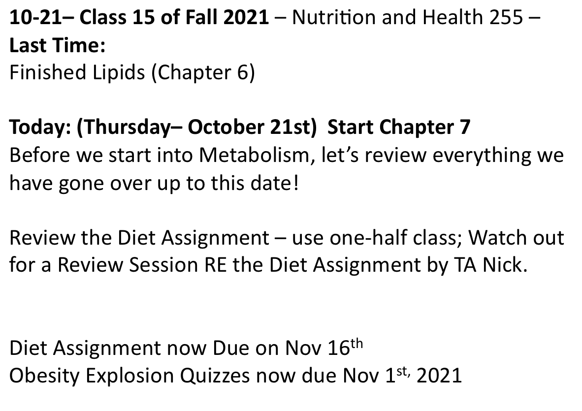 Class 15 – Nutrition and Health – Fall 2021 – October 21st – McGuire Chapter 7 – But First – A Major Review of Carbohydrates, Protein, and Fat up to here! Then, Go Over Diet Assignment