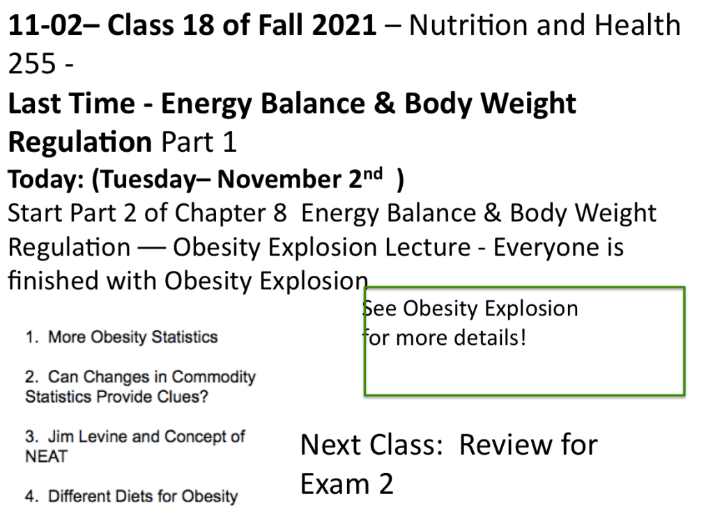 Class 19 – Nutrition and Health – Fall 2021 – November 4th – McGuire Chapter 8 – Finish Energy Maintenance – The Obesity Explosion Lectures; Exam 2 Next Time!