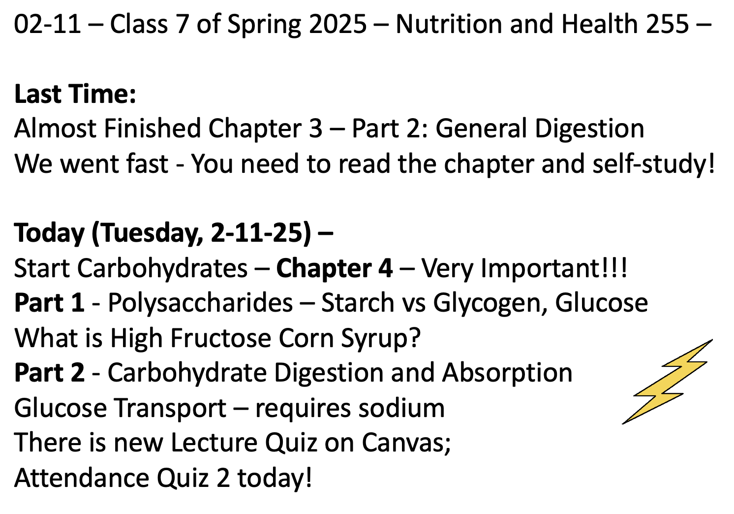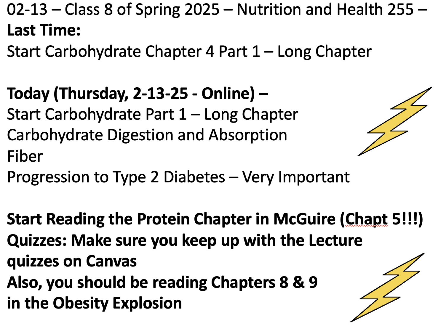 Class 8 – Nutrition and Health – Spring 2025 – February 13th – Chapter 4 in McGuire – Carbohydrates – Part 1