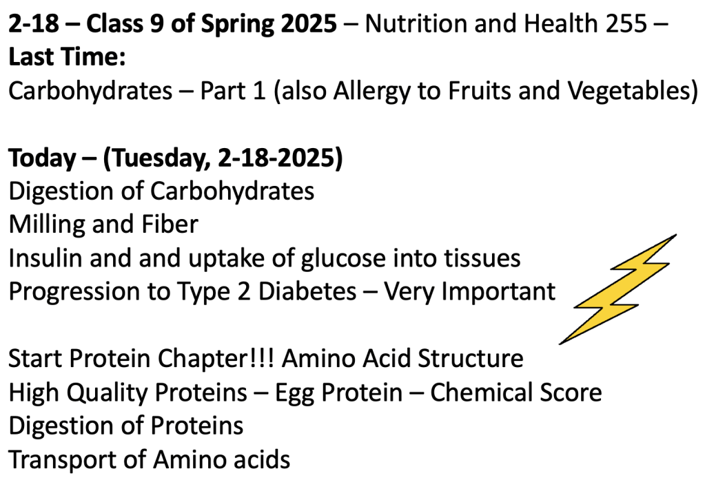 Class 9 – Nutrition and Health – Spring 2025 – February 18th – Chapter 4 in McGuire – Carbohydrates – Digestion, More on Milling, Fiber, and Progression to Type 2 Diabetes