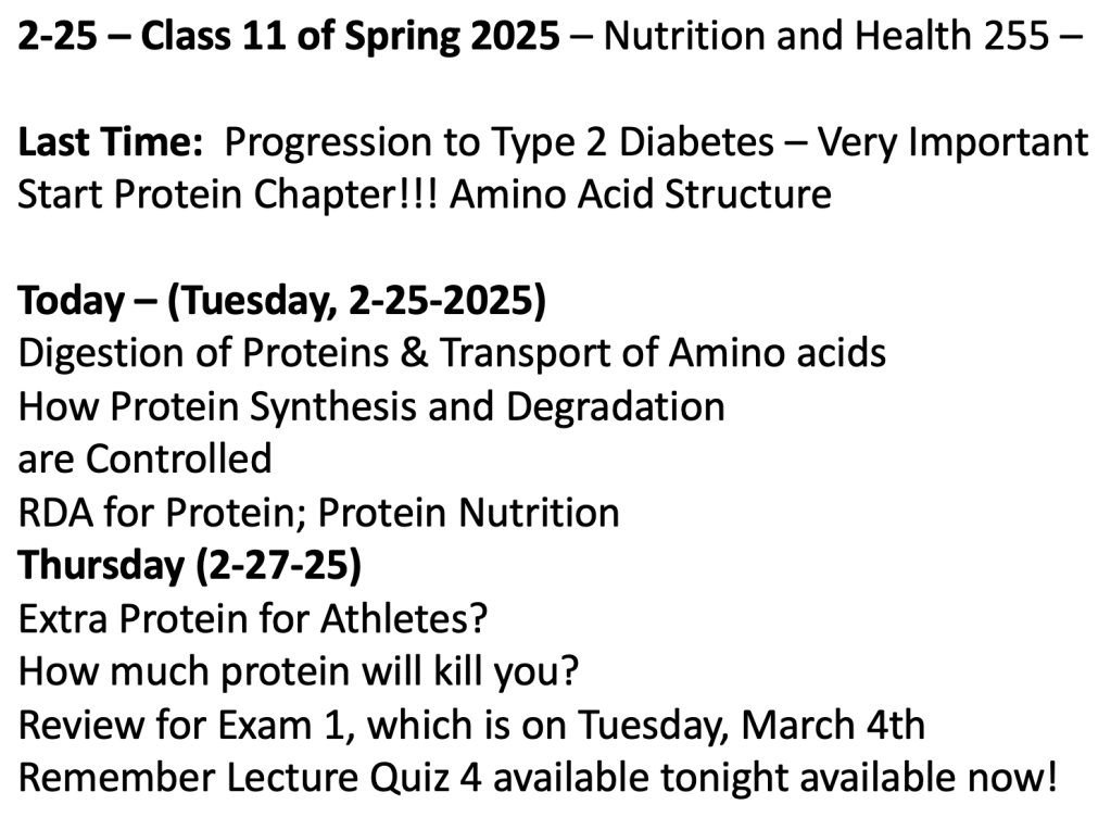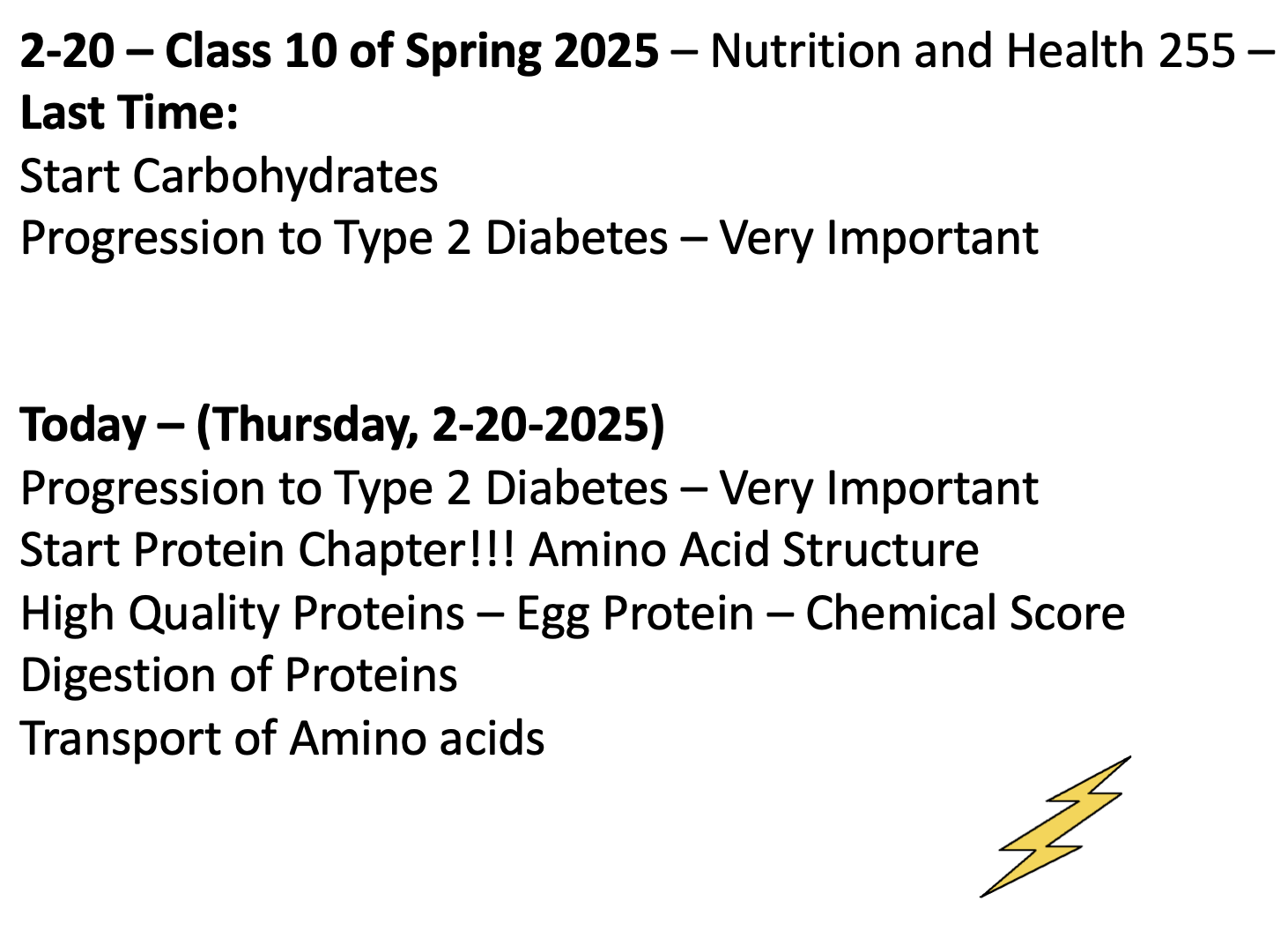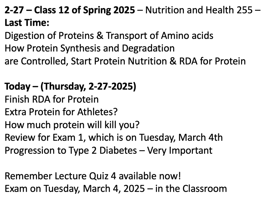 Class 12 – Nutrition and Health – Spring 2025 – February 27th – Chapter 5 in McGuire – Protein & Review for Exam 1
