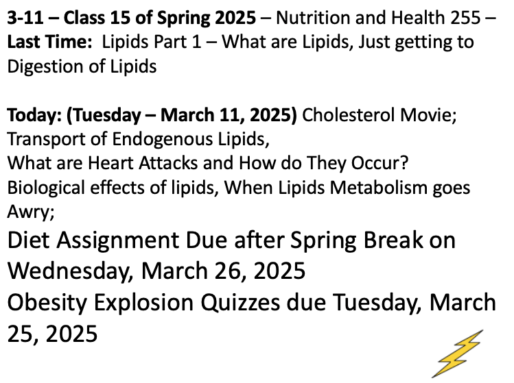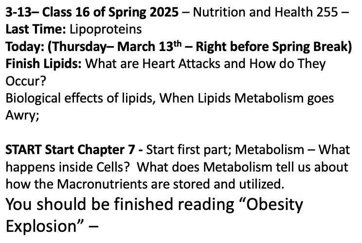 Class 16 – Nutrition and Health – Spring 2025 – March 13th – Chapter 6 in McGuire – Lipids Part 2 – How Heart Attacks Occur