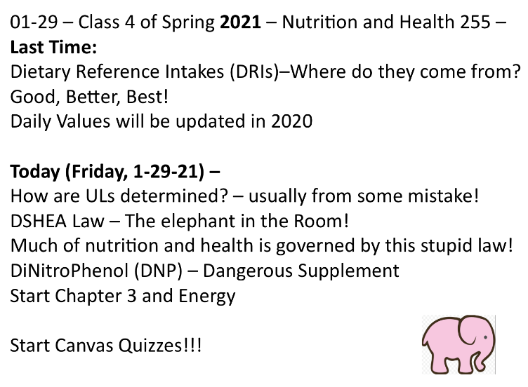 Class 4 – Nutrition and Health – Spring 2021 – Jan 29th – Chapter 3 of McGuire Text – DSHEA and What is Energy?