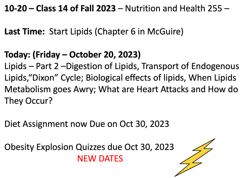 Class 14 – Nutrition and Health – Fall 2023 – October 20th – ONLINE – McGuire 3rd-4th Edition – – Chapter 6 – Part 2 – Lipids – Fat